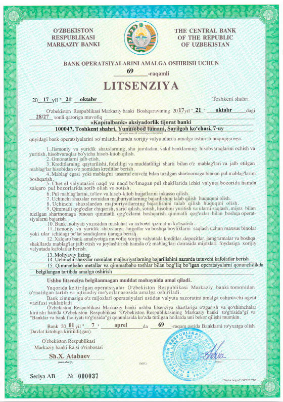 Совокупные активы банка на 1 января 2019 г. составили 30 361,2 млрд.сумов и по сравнению с аналогичным периодом прошлого года увеличились на 6 084,1 млрд.сумов.